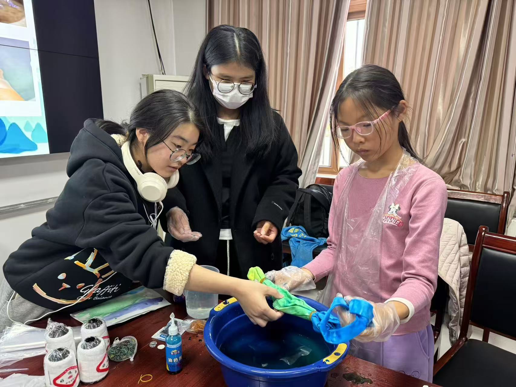 活動開始前,志愿者為社區(qū)兒童分發(fā)提前準備好的扎染所需的材料,包括白色棉布、染料、繩子、手套等,向他們詳細介紹了扎染的歷史和文化底蘊,激起大家對于扎染的興趣。活動過程中,志愿者親身示范,讓他們直觀地了解扎染的制作工藝,提高對傳統(tǒng)文化的認識和保護意識。隨后,志愿者與現(xiàn)場兒童就扎染的圖案展開了問答互動,在一片歡聲笑語中,扎染手工體驗活動正式開始。在志愿者的指導(dǎo)下,大家充分發(fā)揮自己的想象力,小心翼翼地將棉布折疊、扭曲,然后用繩子緊緊地扎起來。在染色環(huán)節(jié),大家紛紛選擇自己喜歡的顏色,將染料涂在自己的扎染作品上,一邊做一邊交流自己的創(chuàng)意,臉上洋溢著快樂的笑容。活動最后,孩子們積極展示自己的作品,志愿者與他們一起合影留念,為今天的活動畫下一個圓滿的句號。
