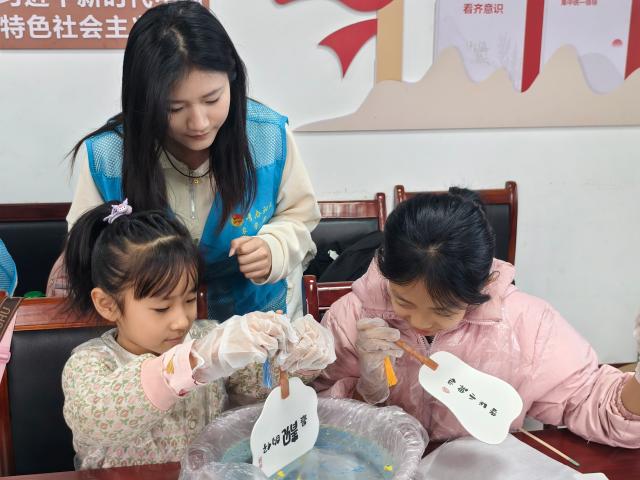 活動(dòng)開(kāi)始前,志愿者為社區(qū)兒童分發(fā)提前準(zhǔn)備好的扎染所需的材料,包括白色扇子、染料、水盆、手套等,向他們?cè)敿?xì)介紹了漆扇的歷史和文化底蘊(yùn),激起大家對(duì)于漆扇的興趣。活動(dòng)過(guò)程中,志愿者親身示范,讓他們直觀地了解漆扇的制作工藝,提高對(duì)傳統(tǒng)文化的認(rèn)識(shí)和保護(hù)意識(shí)。隨后,志愿者與現(xiàn)場(chǎng)兒童就扎染的圖案展開(kāi)了問(wèn)答互動(dòng),在一片歡聲笑語(yǔ)中,扎染手工體驗(yàn)活動(dòng)正式開(kāi)始,隨后小朋友們紛紛加入到漆扇制作行列。先挑選自己喜歡的顏色滴入水中,用竹簽畫(huà)出自己滿意的圖型;再將團(tuán)扇緩緩放入水中上色,拿出水面就會(huì)呈現(xiàn)出一幅美麗的畫(huà)卷,五顏六色的漆扇讓小朋友們非常驚喜,每個(gè)人都在與非遺文化的邂逅中收獲了一份專屬于自己的非遺禮物。活動(dòng)最后,孩子們積極展示自己的作品,志愿者與他們一起合影留念,為今天的活動(dòng)畫(huà)下一個(gè)圓滿的句號(hào)。