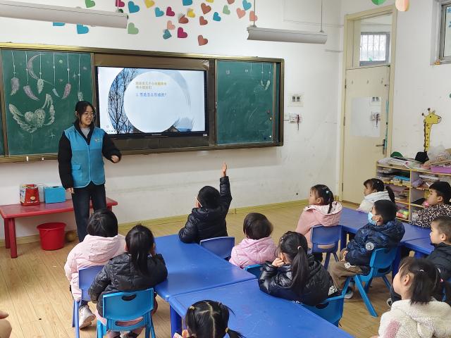 活動伊始,志愿者首先借助精心制作的PPT課件,以童趣的語言和生動的圖片,為小朋友講解雪花的形成原因、六邊形的形狀特征等冬季雪景知識,帶領(lǐng)孩子們在趣味科普中解鎖冬日自然奧秘,點(diǎn)燃他們探索冰雪世界的好奇心。隨后,志愿者組織開展“蘿卜蹲”冰雪主題小游戲,將“雪花蹲”“雪人蹲”等與冬日元素結(jié)合,小朋友們分組參與、輪流喊口令做動作,不僅鍛煉了反應(yīng)能力,更沉浸式感受了冬日的獨(dú)特魅力。游戲結(jié)束后,志愿者還結(jié)合PPT內(nèi)容,為小朋友講解雪中玩耍的安全注意事項(xiàng),提醒大家享受冬日樂趣的同時(shí)保護(hù)好自身安全,讓孩子們在歡樂中收獲知識與安全常識。