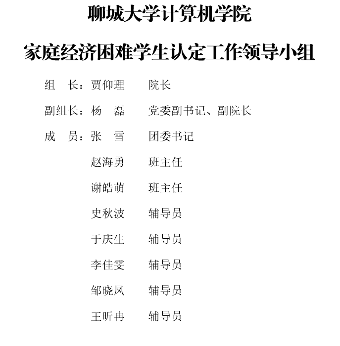 1、學(xué)院工作領(lǐng)導(dǎo)小組。學(xué)院成立由院長為組長,分管學(xué)生工作的副書記為副組長,團委書記、輔導(dǎo)員、班主任為成員的家庭經(jīng)濟困難學(xué)生認定工作小組。