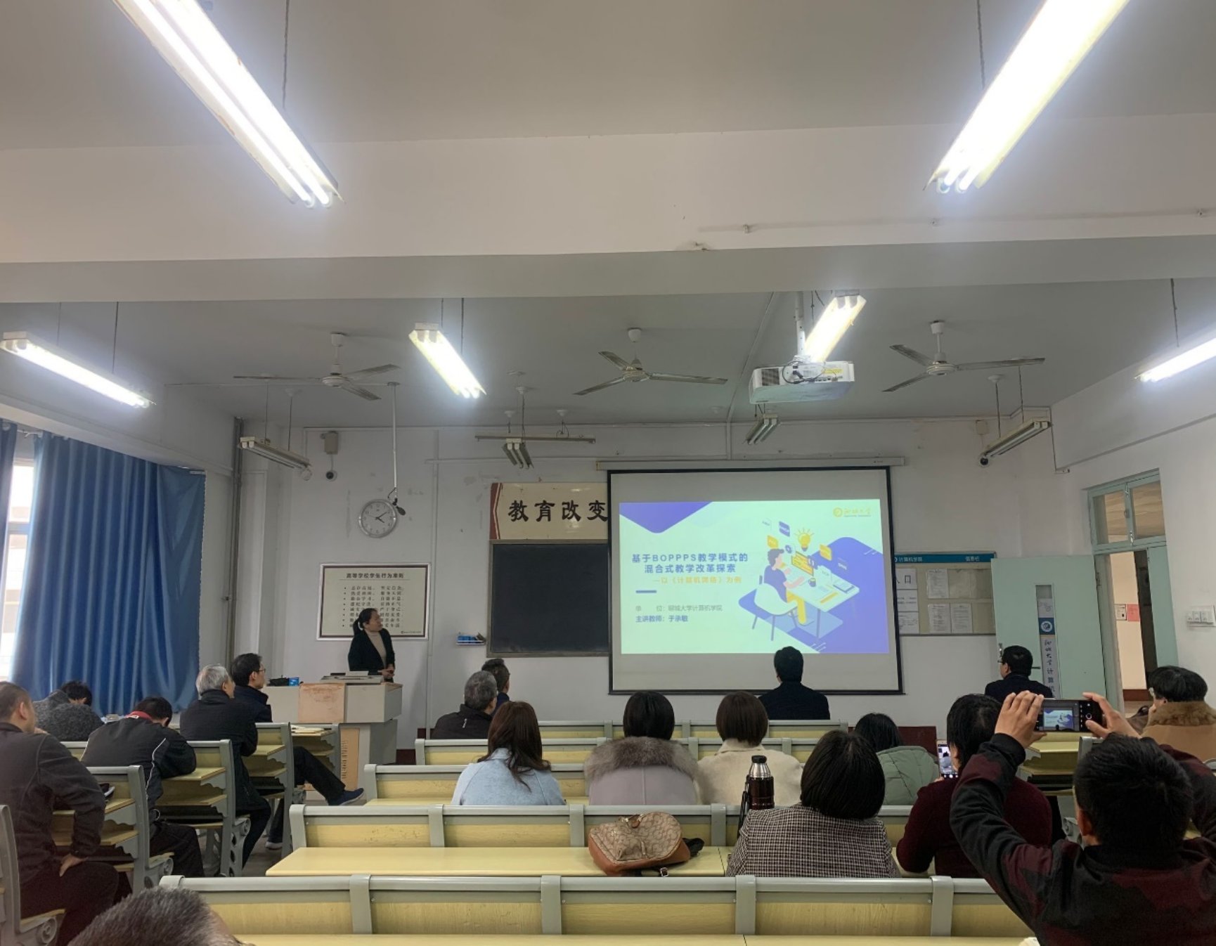 為促進教師間教學經驗的交流,學院召開混合式教學改革研討推進會。3月18日,在我院的全體教工會上,邀請于承敏副教授進行了一次關于混合式教學改革的講座。于承敏,計算機學院副教授,在2021年度聊城大學教學創(chuàng)新大賽中獲得一等獎。本次講座的主題是基于BOPPPS模式的混合式教學改革探索。