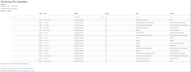 近日,美國斯坦福大學John P.A.Ioannidis教授團隊和愛思唯爾數(shù)據(jù)庫聯(lián)合發(fā)布了第六版《2022年全球前2%頂尖科學家榜單》。榜單以Scopus數(shù)據(jù)庫為依據(jù),基于學者論文引用次數(shù)、H因子等6種指標,從22個領(lǐng)域和176個子領(lǐng)域近700萬名科學家中遴選出世界排名前2%的科學家,目前在國際上尤其是學術(shù)界有較大影響力。