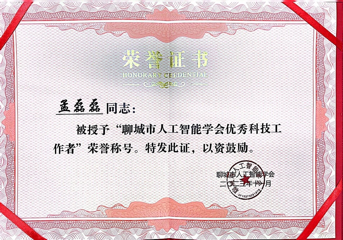 2023年11月11日,2023年聊城市人工智能學(xué)會年會暨科學(xué)大講堂成功召開。會上,聊城市科學(xué)技術(shù)協(xié)會副主席潘云霞等為獲得聊城市人工智能學(xué)會優(yōu)秀科技成果獎及聊城市人工智能學(xué)會優(yōu)秀科技工作者的代表頒發(fā)證書。我院教師孟磊磊博士獲得聊城市人工智能學(xué)會優(yōu)秀科技工作者稱號。
