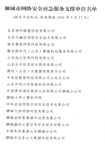 歷經(jīng)相關單位自主申報、材料審核、審批等環(huán)節(jié)嚴格篩選, 近日,聊城市委網(wǎng)信辦發(fā)布了《聊城市網(wǎng)絡安全應急服務支撐單位名單》,最終共有17家具備強大技術實力和社會責任感的網(wǎng)絡安全機構脫穎而出,聊城大學計算機學院位列其中。