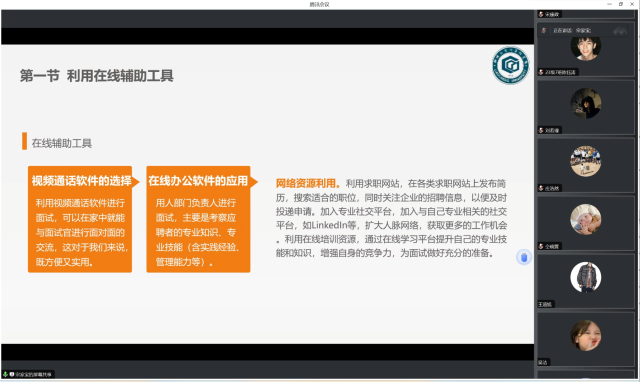 講座中,主講人宗家寶從專業(yè)知識和面試經(jīng)歷出發(fā),結(jié)合理論和實(shí)踐,從疫情影響下的就業(yè)形勢、面試技巧的基礎(chǔ)要點(diǎn)、遠(yuǎn)程面試的準(zhǔn)備與應(yīng)對、政策支持與社會(huì)資源四個(gè)方面為同學(xué)們詳盡全面的講解了求職面試禮儀與技巧。首先,宗家寶從疫情下企業(yè)招聘壓力、線上求職成為主流、特殊群體就業(yè)困難增加三方面詳細(xì)講解了疫情大環(huán)境下就業(yè)求職面試的劣勢弊端和困難挑戰(zhàn),鼓勵(lì)大家可以正式環(huán)境壓力,努力爭取心儀的就業(yè)崗位。其次,宗家寶重點(diǎn)分析了突出自身優(yōu)勢、展示適應(yīng)能力、表達(dá)積極態(tài)度三個(gè)面試禮儀和技巧,特別強(qiáng)調(diào)了面試結(jié)束時(shí)也要注意主動(dòng)告辭、表示感謝等禮儀。最后,宗家寶向同學(xué)們展示了利用在線輔助工具和遠(yuǎn)程面試設(shè)備檢查的技巧以準(zhǔn)備和應(yīng)對遠(yuǎn)程面試,并分享求職網(wǎng)站和遠(yuǎn)程面試設(shè)備檢查應(yīng)用以做到對遠(yuǎn)程面試的充分了解。會(huì)議結(jié)束后,與會(huì)同學(xué)紛紛表示對遠(yuǎn)程面試有了進(jìn)一步的了解,掌握了面試禮儀與技巧,為以后的就業(yè)求職奠定了基礎(chǔ)。
