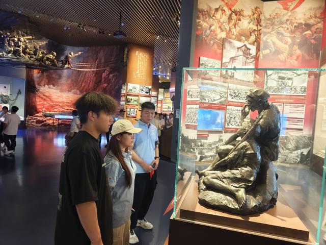 踏入展館,巨幅漆壁畫《長(zhǎng)城頌》以萬(wàn)山紅遍之勢(shì)鋪展,既象征革命先烈用血肉鑄就的精神長(zhǎng)城,也詮釋"江山就是人民"的深刻內(nèi)涵。實(shí)踐隊(duì)員凝視畫作,深切感悟和平生活的來(lái)之不易。前行中,百年黨史畫卷徐徐展開。中共一大會(huì)址復(fù)原場(chǎng)景里,煤油燈映照先驅(qū)探索真理的堅(jiān)定;紅軍長(zhǎng)征展品靜默陳列,訴說(shuō)著革命先輩為民族獨(dú)立而戰(zhàn)的壯闊征程。這些承載信仰與奉獻(xiàn)的展品,化作穿越時(shí)空的精神力量,讓隊(duì)員們既震撼于先輩的英勇,又感動(dòng)于信念的堅(jiān)韌。