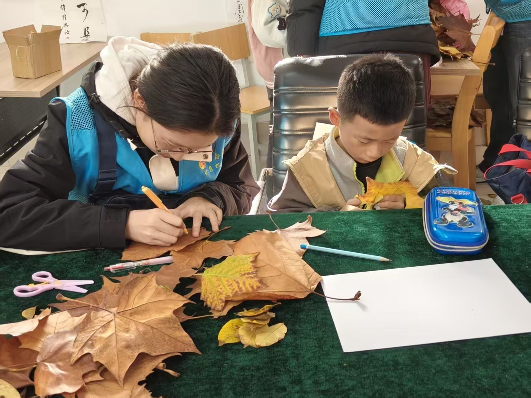 實踐隊員清晰介紹了本次活動的核心主題、詳細(xì)流程及各類安全注意事項,特別強調(diào)“只撿落葉、不摘新葉”的生態(tài)保護原則,引導(dǎo)孩子們樹立“尊重自然、愛護植被”的環(huán)保理念。科普講解環(huán)節(jié)中,實踐隊員用通俗易懂的語言,向孩子們解讀了落葉的形成原因、生態(tài)價值和各種類樹葉的簡易識別方法。這不僅豐富了他們的自然知識儲備,更引導(dǎo)他們學(xué)會用科學(xué)的視角去觀察和解讀自然現(xiàn)象。孩子們手持精心收集的落葉,依照不同葉片的色彩層次與形態(tài)大小,將各類自然元素有機融合,把落葉變?yōu)榧婢咄づc藝術(shù)感的創(chuàng)意作品,其中既有栩栩如生的動物造型,亦有充滿詩意的風(fēng)景畫卷。孩子們紛紛表示,通過聆聽科普講解和動手創(chuàng)作,不僅解鎖了落葉背后的科學(xué)奧秘,還體驗到將創(chuàng)意變?yōu)楝F(xiàn)實的滿滿成就感。