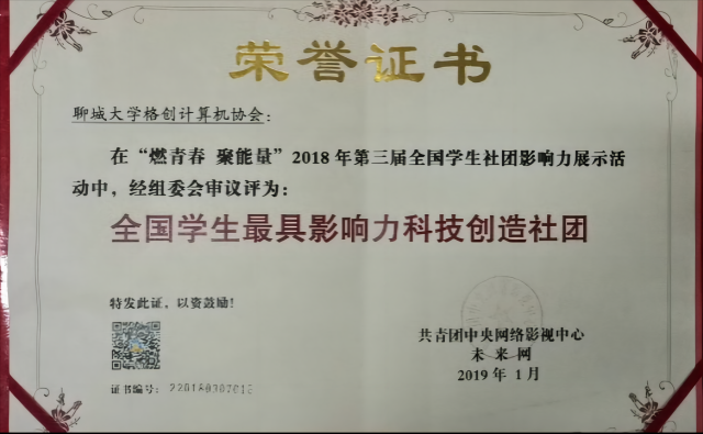 近五年來,格創(chuàng)計(jì)算機(jī)協(xié)會(huì)曾在“燃青春 聚能量”第三屆全國學(xué)生社團(tuán)影響力展示活動(dòng)中被評(píng)為“全國學(xué)生最具影響力科技創(chuàng)造社團(tuán)”,在聊城大學(xué)2020年度共青團(tuán)先優(yōu)評(píng)選表彰中被評(píng)為“大學(xué)生社團(tuán)工作先進(jìn)集體”,成功立項(xiàng)“聊城大學(xué)2022年度十佳團(tuán)支部”。