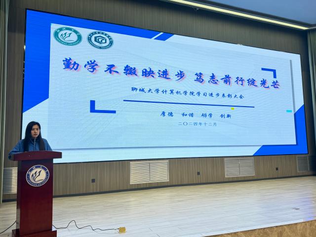 活動伊始,張雪宣讀本次表彰大會獲獎名單,其中共有66名同學獲得學習進步獎。大會上,學習進步獎獲獎學生代表進行發(fā)言,分享了自己在日常學習、生活過程中的心得體會。從克服困難的勇氣到堅持不懈的努力,從團隊合作的力量到自我超越的喜悅,每一個故事都激勵著在場的每一個人。他們的發(fā)言,不僅是對過去成績的回顧,更是對未來挑戰(zhàn)的宣誓,展現(xiàn)了計算機學院學子不畏艱難、勇往直前的精神風貌。最后,楊磊發(fā)表講話,他首先對獲獎的同學表示熱烈的祝賀,并且強調學習進步對于個人成長和學院發(fā)展的重要性,鼓勵所有學生以受表彰的同學為榜樣,不畏艱難,勇于挑戰(zhàn),持續(xù)追求卓越。同時在保證學習的前提下,注重身體素質的提升,利用課余時間進行體育鍛煉,也要培養(yǎng)、提升個人創(chuàng)新意識和實踐能力,實現(xiàn)高質量全面發(fā)展。