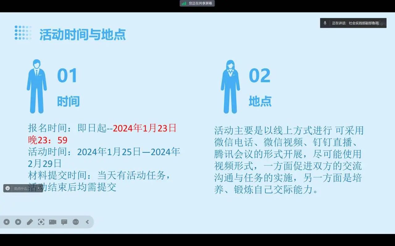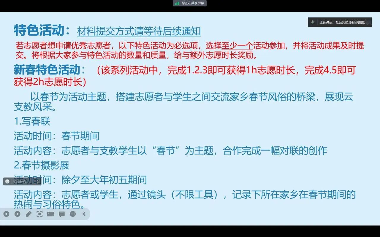 為了讓志愿者們更快地熟悉活動(dòng)內(nèi)容和流程,魯雨對(duì)全國大學(xué)生2024寒假“返家鄉(xiāng)”社會(huì)實(shí)踐“一起云支教”專項(xiàng)活動(dòng)進(jìn)行詳細(xì)說明,主要分為活動(dòng)簡介和要求兩方面。她通過活動(dòng)的不同板塊詳細(xì)地介紹了志愿者的任務(wù)與職責(zé),以及活動(dòng)的實(shí)施方案與內(nèi)容,并對(duì)同學(xué)們提出的相關(guān)問題答疑解惑。隨后,主講人說明了活動(dòng)的要求,除對(duì)志愿者做出了基本要求以外,對(duì)學(xué)生個(gè)人信息的保密方面也做了強(qiáng)調(diào),讓志愿者們對(duì)活動(dòng)內(nèi)容和要求有了更深入的理解和認(rèn)識(shí)。最后,魯雨介紹了不同活動(dòng)板塊的志愿者時(shí)長占比情況,并呼吁同學(xué)們要以飽滿的熱情和專業(yè)的態(tài)度投入到志愿服務(wù)中,盡己所能的為社會(huì)獻(xiàn)出一份力量。