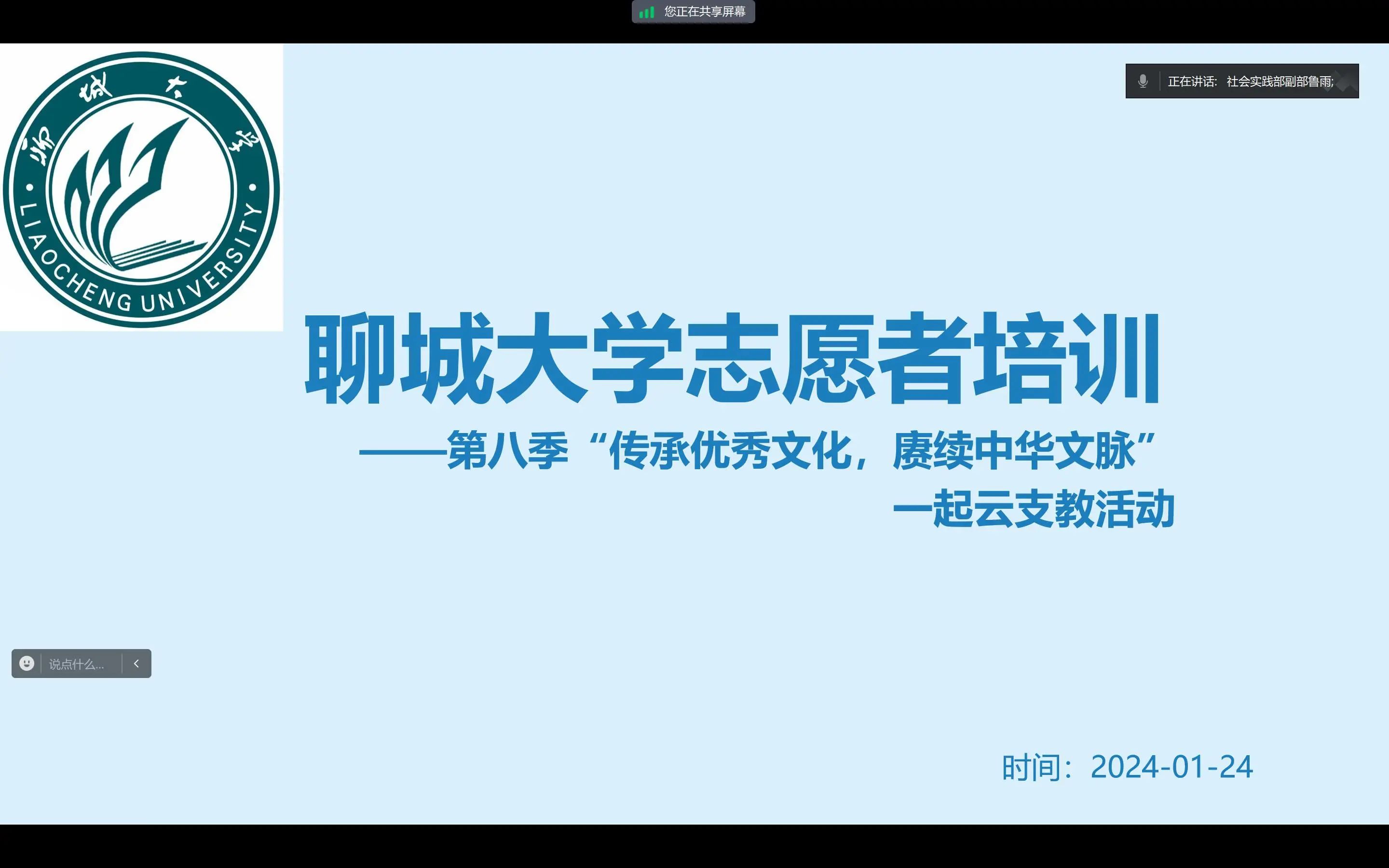 為深入學(xué)習(xí)貫徹習(xí)近平新時(shí)代中國特色社會(huì)主義思想和黨的二十大精神,更好地引領(lǐng)廣大青年弘揚(yáng)志愿者服務(wù)精神,進(jìn)一步激發(fā)他們的積極性、榮譽(yù)感和自覺性,1月24日,計(jì)算機(jī)學(xué)院于線上開展“傳承優(yōu)秀文化,賡續(xù)中華文脈”主題“一起云支教”活動(dòng)志愿者動(dòng)員大會(huì),計(jì)算機(jī)學(xué)院社會(huì)實(shí)踐部工作人員魯雨擔(dān)任主講人。