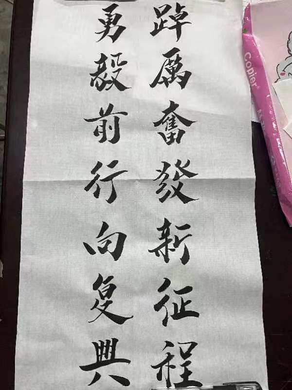 秘書處工作人員提前準(zhǔn)備好本次活動(dòng)所需要的宣紙、毛筆和硯臺(tái)等工具,并對(duì)同學(xué)們的坐姿、握筆姿勢(shì)、書法的書寫等方面進(jìn)行簡(jiǎn)單的教授,帶領(lǐng)同學(xué)們學(xué)習(xí)漢字的書寫方式,讓同學(xué)們對(duì)書法有了基本認(rèn)識(shí),隨后同學(xué)們進(jìn)行現(xiàn)場(chǎng)實(shí)踐。書寫時(shí),同學(xué)們個(gè)個(gè)滿懷激情,坐姿端正,全神貫注地投入,用心書寫每一筆畫,在紙張盡情揮灑筆墨,劃過(guò)空白的紙張,揮毫潑墨,在宣紙上盡情展現(xiàn)書法的獨(dú)特魅力。同學(xué)們一起學(xué)習(xí)討論書法作品,整個(gè)活動(dòng)現(xiàn)場(chǎng)都沉浸在一片濃墨飄香的氛圍中。活動(dòng)臨近尾聲,同學(xué)們完成了自己的作品,橫平豎直,結(jié)構(gòu)勻稱,整體美觀,在同學(xué)們的歡聲笑語(yǔ)中,本次活動(dòng)圓滿完成。