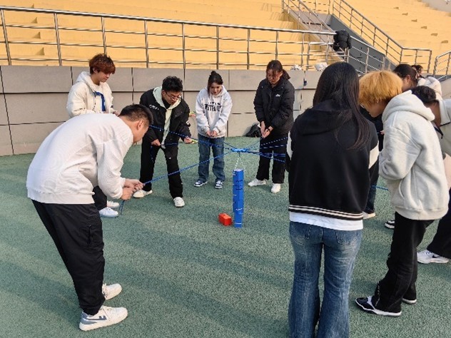活動開始前,主持人簡單地向大家介紹了游戲規(guī)則,新穎的活動內容迅速點燃了大家的熱情。隨著活動開始,參與者們被分成一個大組,圍成一個大圓圈,手持系有繩子的積木鉤。在主持人的引導下,大家通過精確的拉繩動作和默契的配合,將五塊積木穩(wěn)穩(wěn)地搭建起來。過程中,組內每個成員分工明確,有的負責拉繩控制積木移動,有的負責調整積木位置以確保穩(wěn)定性,還有的負責觀察整體結構并提出移動方案,整個過程中大家相互鼓勵,共同面對挑戰(zhàn)。經過多次嘗試和調整,大家都順利地成功完成了積木搭建任務,伴隨著一陣陣歡呼聲,每個人臉上都洋溢出了笑容。此外,活動中還穿插了輕松有趣的跳大繩和傳遞呼啦圈環(huán)節(jié),進一步加深了同學們之間的友誼與默契。