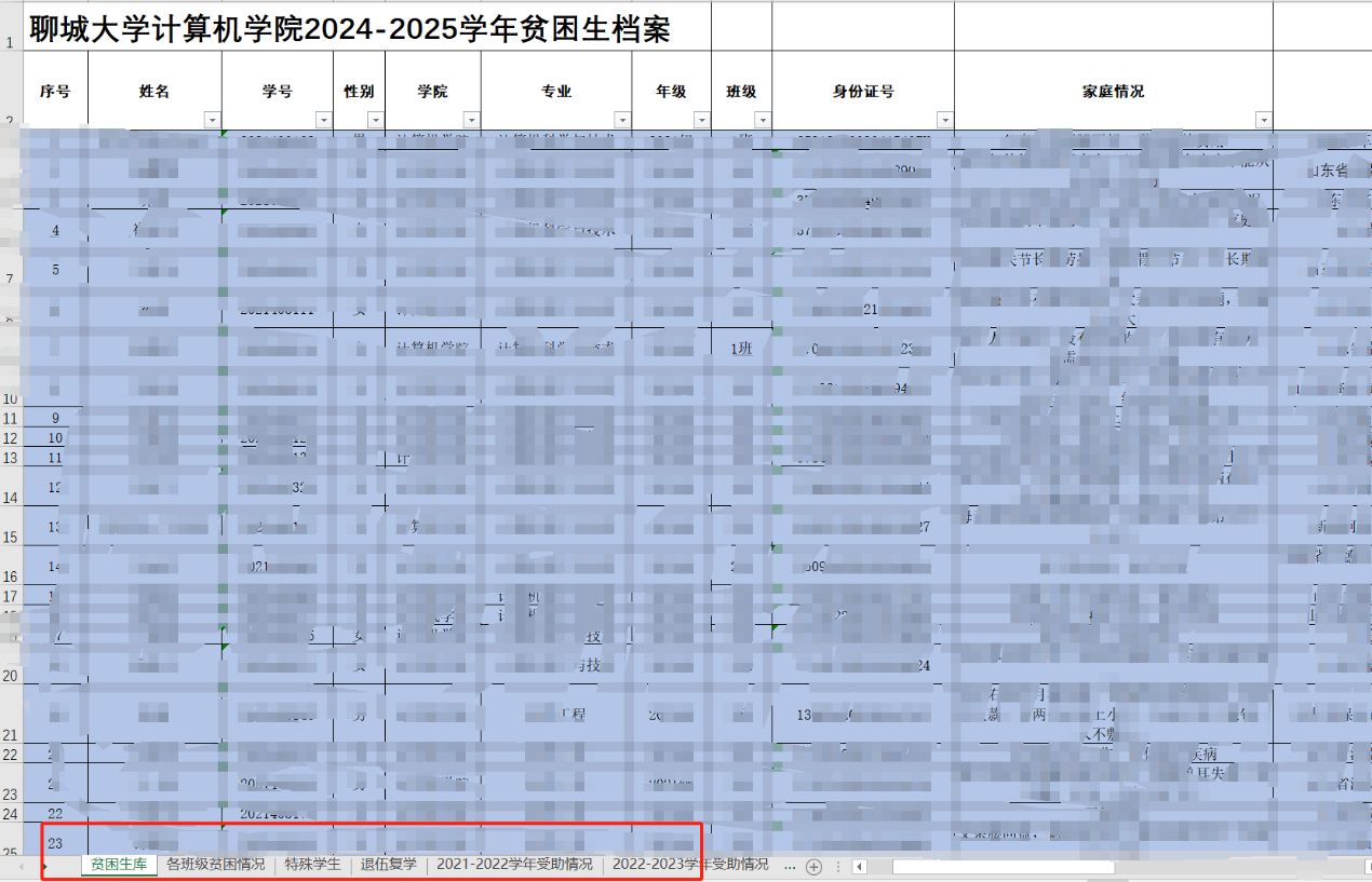 針對學(xué)院家庭經(jīng)濟困難學(xué)生逐一建立信息檔案臺賬,保證一人一檔。該檔案涵蓋個人基本信息、在校住宿信息、學(xué)生家庭經(jīng)濟情況(含家庭主要成員職業(yè)狀況、健康狀況、收入狀況等)、學(xué)生本年度獲資助情況、其他幫扶措施及幫扶成效等,對家庭經(jīng)濟困難學(xué)生實施動態(tài)管理。