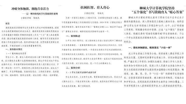 學(xué)生資助工作是維護(hù)教育公平、促進(jìn)社會(huì)和諧的關(guān)鍵舉措,對(duì)于推動(dòng)教育脫貧攻堅(jiān)、實(shí)現(xiàn)社會(huì)整體進(jìn)步具有深遠(yuǎn)意義。2024年,計(jì)算機(jī)學(xué)院秉持發(fā)展型資助的核心理念,將“扶志”與“扶智”緊密結(jié)合于資助育人的全過(guò)程,致力于構(gòu)建精準(zhǔn)資助的標(biāo)準(zhǔn)化體系與長(zhǎng)效育人的綜合機(jī)制,推動(dòng)資助工作向更高質(zhì)量、更深層次發(fā)展。展望未來(lái),計(jì)算機(jī)學(xué)院將繼續(xù)深化資助育人內(nèi)涵,拓寬資助渠道,強(qiáng)化資助效果評(píng)估,努力構(gòu)建更加完善、更加高效的資助工作體系,為培養(yǎng)德智體美勞全面發(fā)展的社會(huì)主義建設(shè)者和接班人貢獻(xiàn)力量。今年,計(jì)算機(jī)學(xué)院完成了三篇資助案例的編寫(xiě)和報(bào)送,完成資助論文兩篇,徐培文撰寫(xiě)的《理工類退役復(fù)學(xué)大學(xué)生資助育人工作研究》被《北大荒文化》雜志,范飛越撰寫(xiě)的《基于大數(shù)據(jù)技術(shù)的高校資助育人效果評(píng)估與優(yōu)化研究》被《探索科學(xué)》雜志錄用錄用,成果斐然。