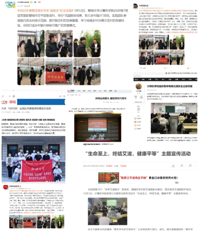 2022年我院扎實開展社會實踐活動并取得優(yōu)異成績。我院成功獲批1支全國專項、1支全國重點服務隊,在2022年全國大學生延安暑期社會實踐專項活動中,我院“延安情·中國夢”實踐服務隊獲得“優(yōu)秀實踐團隊”稱號,獲得山東省大中專學生志愿者“三下鄉(xiāng)”社會實踐優(yōu)秀指導教師與優(yōu)秀學生3人,聊城大學暑期社會實踐優(yōu)秀示范服務隊1支,聊城大學暑期社會實踐優(yōu)秀品牌項目一等獎1個,聊城大學暑期“三下鄉(xiāng)”社會實踐優(yōu)秀調研報告二等獎、三等獎各1個。