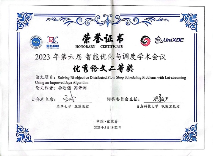 近日,我院高開周老師課題組最新研究成果《An Improved Artificial Bee Colony Algorithm with Q-learning for Solving Permutation Flow-shop Scheduling Problems》獲得第六屆智能優(yōu)化與調(diào)度學(xué)術(shù)會(huì)議優(yōu)秀論文二等獎(jiǎng)。該論文第一作者為我院2020級(jí)碩士研究生李晗瀟,指導(dǎo)老師為高開周博士。我院桑紅燕教授作為頒獎(jiǎng)嘉賓之一,為獲獎(jiǎng)?wù)哳C獎(jiǎng)。