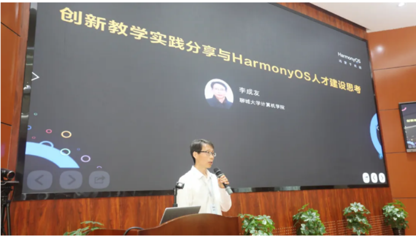 李成友以《創(chuàng)新教學(xué)實(shí)踐分享與HarmonyOS人才建設(shè)思考》為題,分享了新工科建設(shè)和鴻蒙快速崛起的背景下,面對高校人才培養(yǎng)方面存在的共性問題,聊城大學(xué)計(jì)算機(jī)學(xué)院開展“11223”人才培養(yǎng)模式的探索與實(shí)踐。